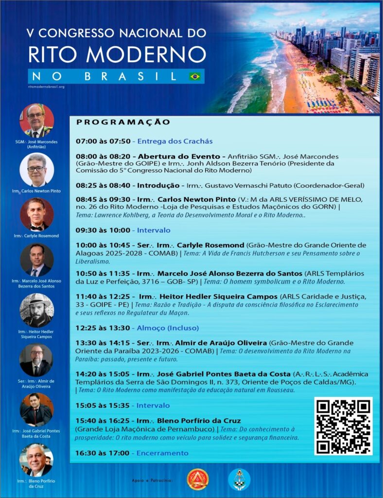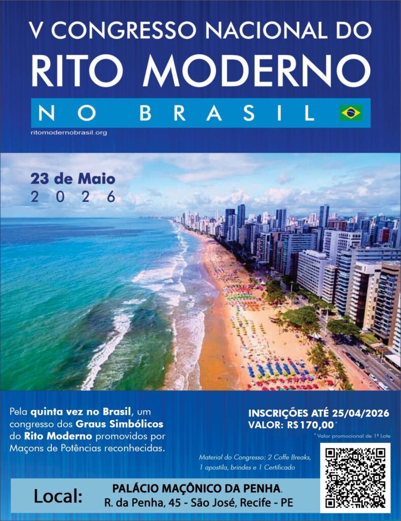 Por José Anderson M. de Meneses No último dia 29 de novembro de 2025, a cidade maravilhosa, Rio de Janeiro, sediou o V Congresso Regional do Rito Moderno no Brasil, […]Continuar lendo- 1ª Palestra do 4º Congresso Nacional do RM: 301 anos da Constituição de Anderson e o Rito Moderno Ser. Irm. Sérgio Quirino Guimarães (Grão Mestre da Grande Loja Maçônica de […]Continuar lendo